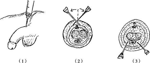 注药于阴茎根部,适用于阴茎的各种手术。平卧位,先于阴茎根部背侧进针皮内、皮下环形浸润注射麻醉药1周,再行阴茎背侧分别向左右倾斜15°~20°至两侧阴茎神经附近,回抽无血后分别注入麻醉药2~3ml,最后在阴茎根部的腹侧、尿道海绵体两旁分别垂直进针达尿道海绵体与阴茎海绵体间沟各注麻醉药1~2ml(图2-33)。用手轻轻地按摩注药部位,促使药液均匀扩散。