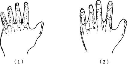 于患指(趾)根部两侧分别注射皮丘后向掌面和背面注射麻醉药2~4ml;或于手背掌指关节两侧进针,分别注入麻醉药2~4ml(图2-32)。