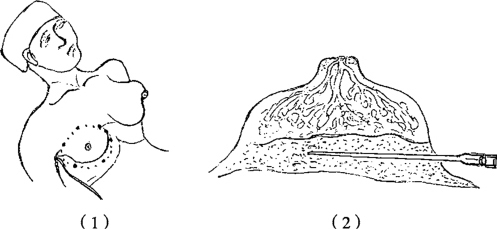 取平卧位,先于乳房周围利用“一针技术”皮内或真皮下注射麻醉药,再分别浸润注射乳房四周皮下组织,最后注射乳房基底部(图2-29)。