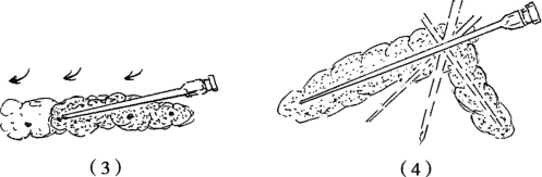 (1)沿预定的皮肤切口,针尖斜向皮肤,先注射一个小皮丘[图2-26(1)]。