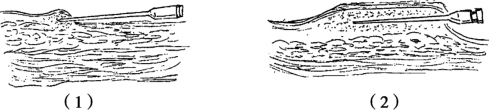 (2)针尖与皮肤平行,通过皮肤处的皮丘向前推进[图2-26(2)]。