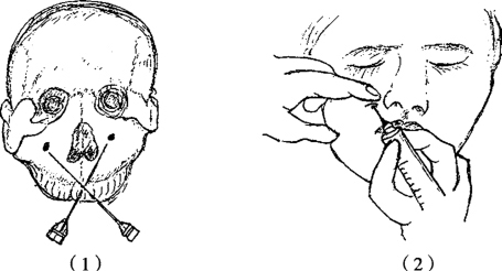 注麻醉药于眶下孔,阻滞眶下神经,同侧下睑、鼻、眶下部、上唇及上前牙、双尖牙、唇颊侧骨膜等组织均可被麻醉,因此,该麻醉方法适用于面部手术。施术者先用左手示指扪出眶下孔位置,眶下孔位于眶下缘中点下约0.6cm,针尖从鼻翼外侧约1cm处刺入皮肤,且成45°角斜向上、后、外方向眶下孔区,在左手示指引导下将针尖刺入孔内0.5cm注射药物0.5~1.0ml,注意穿刺时防止损伤眼球(图2-34)。