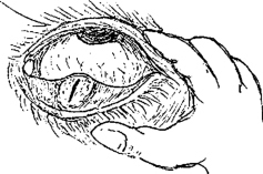 局部消毒后翻转眼睑,刀尖对准脓点,垂直睑缘切开脓点处睑结膜,脓液可自行经创口排出。如脓液多,排脓后冲洗结膜囊。切忌挤压排脓,也不可用刮匙搔抓,以防感染至静脉扩散,导致严重的并发症(图3-2)。
