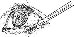局部消毒后,用尖刀片刺切脓点中央,平行睑缘扩大切口至脓液自行流出,如脓液黏稠,用小镊子夹取脓头以促脓液排出(图3-1)。
