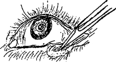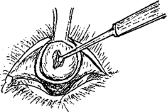 1.根据睑板腺囊肿大小,选择适当的睑板腺囊肿夹夹住肿粒,在肿粒的中央,用刀尖垂直于睑缘方向切开睑结膜(图3-3)。如睑板腺囊肿破溃,增生的组织突出于睑结膜或皮肤,先剪除脱出的组织,再将切口扩大(图3-4)。