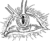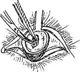 1.根据睑板腺囊肿大小,选择适当的睑板腺囊肿夹夹住肿粒,在肿粒的中央,用刀尖垂直于睑缘方向切开睑结膜(图3-3)。如睑板腺囊肿破溃,增生的组织突出于睑结膜或皮肤,先剪除脱出的组织,再将切口扩大(图3-4)。