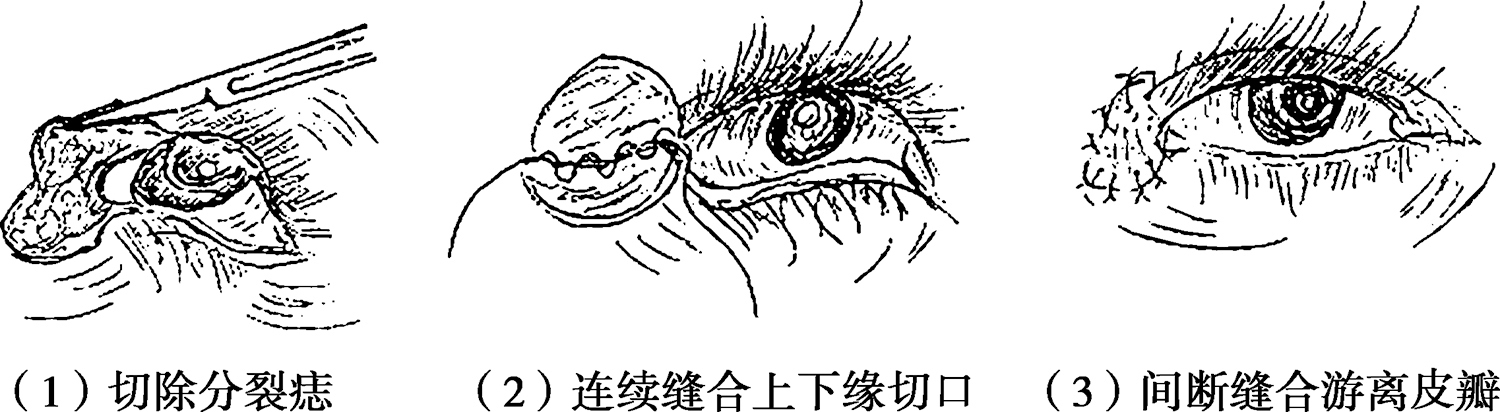 1.局麻下切除上下睑分裂痣,受累睑缘一并切除,睑结膜受累不多可一并切除,如受累太多留待二期手术[图3-12(1)]。