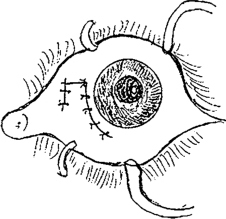 翼状胬肉的切除同前。从结膜切口向下分离达下穹隆,将胬肉头置褥式缝线引入结膜下方,从穹隆附近处穿出后结扎缝线(图3-26)。结膜创缘间断缝合。术毕时患眼处理同前。
