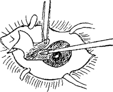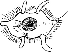 ①开睑器撑开眼睑,用有齿镊子夹住胬肉头部,从边缘外0.5~1.0mm处做浅层角膜切开,仔细地将胬肉组织与角膜组织分离到角膜缘(图3-19)。②剪开胬肉芽组织两侧球结膜,分离角膜缘处的粘连,钝性分离巩膜上的组织(图3-20),继续分离结膜下胬肉组织直达半月皱襞,切除已分离的所有肉芽组织(图3-21)。③仔细止血后,再行巩膜面的刮切,使之巩膜表面光滑平整。以将切除后的结膜缘间断缝合于角膜巩膜外3~4mm的巩膜面,使部分巩膜面显露(图3-22)。结膜囊涂抗生素眼膏,包盖术眼。