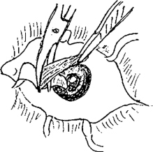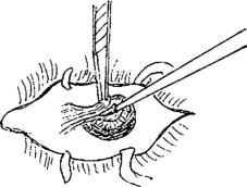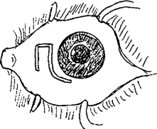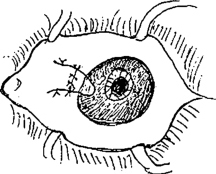 翼状胬肉的切除同前。从结膜切口向下分离达下穹隆,将胬肉头置褥式缝线引入结膜下方,从穹隆附近处穿出后结扎缝线(图3-26)。结膜创缘间断缝合。术毕时患眼处理同前。