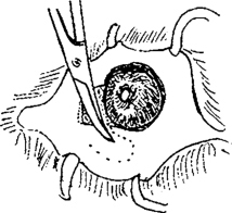 ①开睑器撑开眼睑,用有齿镊子夹住胬肉头部,从边缘外0.5~1.0mm处做浅层角膜切开,仔细地将胬肉组织与角膜组织分离到角膜缘(图3-19)。②剪开胬肉芽组织两侧球结膜,分离角膜缘处的粘连,钝性分离巩膜上的组织(图3-20),继续分离结膜下胬肉组织直达半月皱襞,切除已分离的所有肉芽组织(图3-21)。③仔细止血后,再行巩膜面的刮切,使之巩膜表面光滑平整。以将切除后的结膜缘间断缝合于角膜巩膜外3~4mm的巩膜面,使部分巩膜面显露(图3-22)。结膜囊涂抗生素眼膏,包盖术眼。