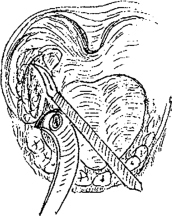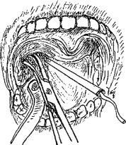 患者坐位,双手持肾形盘,在局部麻醉下,选择脓肿明显部位经穿刺抽得脓液处行切开(图4-25、图4-26)。切开黏膜及浅层组织,用一中弯血管钳向后外方顺肌纤维走向逐层分离,直达脓腔(图4-27)。时有脓腔多个,需逐个充分开放,不需置放引流物。