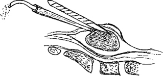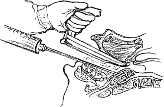 图4-29 在直视喉镜下穿刺咽喉脓肿