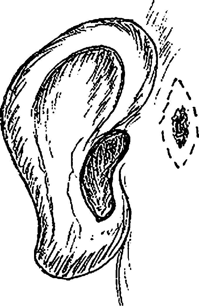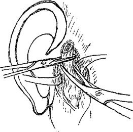 2.分离瘘管周围组织,将分支全部分离出,瘘管与耳轮脚软骨粘连部分,应将软骨切一部分,必要时减张缝合切口,消灭孔腔,局部加压包扎伤口(图4-33、图4-34)。