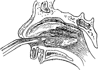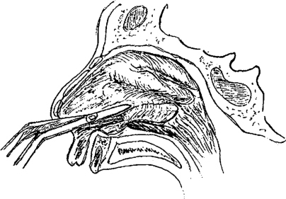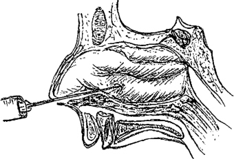 用1%丁卡因棉片表面麻醉,并在下鼻甲黏膜下注射含少量1‰肾上腺素液的1%利多卡因1~2ml(图4-35)。
