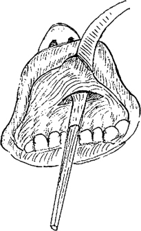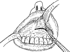 1.患者仰卧,用拉钩将上唇向上拉起,在术侧上牙列唇沟做黏膜下浸润麻醉,向后达第二前磨牙。同时在尖耳窝及梨状孔处浸润麻醉(图4-47)。距离唇龈沟上约0.5cm处自侧切牙至第二前磨牙做横切口,一般呈弧形(图4-48)。剥离黏膜下组织和骨膜,向内外上三个方向推送剥离(图4-49)。齿开前壁,清除上颌窦病变组织(图4-50),清除上颌窦内的息肉、囊肿、坏死组织等物,病变组织应送病理检查,创面冲洗,张力底止血。