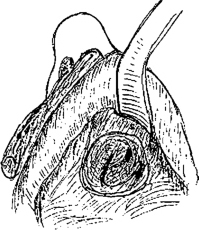 3.填塞鼻腔 可选用碘仿纱条填塞,自下鼻道送入纱条的一端,将黏膜瓣贴平后压住,再将纱条填满窦腔,另一端对孔留于下鼻道的前端(图4-51)。