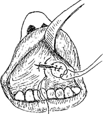 通常采用黏膜表面麻醉加局部麻醉。以浸有麻醉药的棉片置于术侧下鼻道及鼻顶部,待10分钟后,另以1%利多卡因20ml,内加1‰肾上腺素3~4滴,分别阻滞:①三叉神经上颌支;②眶下神经;③切口局部浸润麻醉。