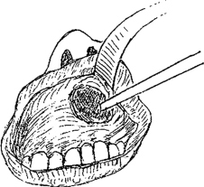 1.患者仰卧,用拉钩将上唇向上拉起,在术侧上牙列唇沟做黏膜下浸润麻醉,向后达第二前磨牙。同时在尖耳窝及梨状孔处浸润麻醉(图4-47)。距离唇龈沟上约0.5cm处自侧切牙至第二前磨牙做横切口,一般呈弧形(图4-48)。剥离黏膜下组织和骨膜,向内外上三个方向推送剥离(图4-49)。齿开前壁,清除上颌窦病变组织(图4-50),清除上颌窦内的息肉、囊肿、坏死组织等物,病变组织应送病理检查,创面冲洗,张力底止血。