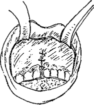 2.用露钩将上唇向上牵开,使系带呈紧张状态,以横向切断系带,然后将创面纵向间断缝合(图5-12~图5-15),如缝合时张力过大,可将创面稍加潜行剥离后缝合。