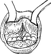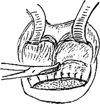 2.用露钩将上唇向上牵开,使系带呈紧张状态,以横向切断系带,然后将创面纵向间断缝合(图5-12~图5-15),如缝合时张力过大,可将创面稍加潜行剥离后缝合。