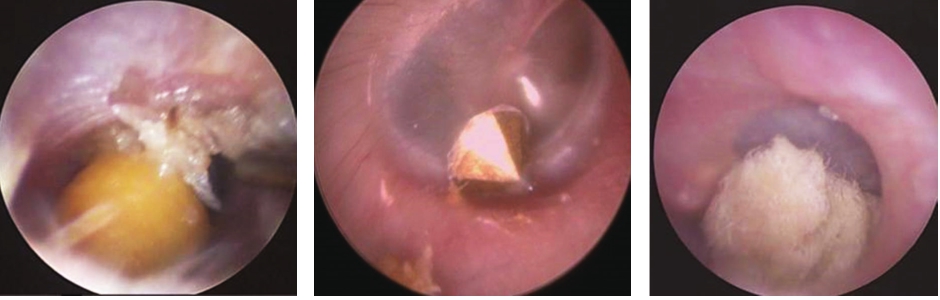 图5-2 外耳道可见黄豆、塑料及棉花遗留