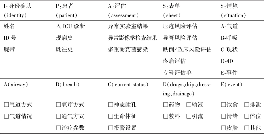 核心研究团队由医生1名、科护士长1名、护士长3名、主管护师2名、护士3名组成。通过对SBAR交班模式进行改良设计,并查阅相关文献及专家咨询,加入ICU专科特色元素,如高危风险预警、监护、呼吸治疗参数、报警设置、气道管理、管路维护等,最终制定出符合ICU实际情况的结构化交班模板,将10项交班内容分为5个部分,并以“I PASS ABCDE”口诀加以设计,各字母代表内容如下:身份确认(identity)、患者病史相关资料(patient)、评估(assessment)、表单(sheet)、情境(situation)、气道管理(airway)、呼吸治疗(breath)、现状(current Status)、4D[药物(drugs)、输液(drip)、敷料(dressing)、引流(drainage)]、事件(event)。见表1-4-1。