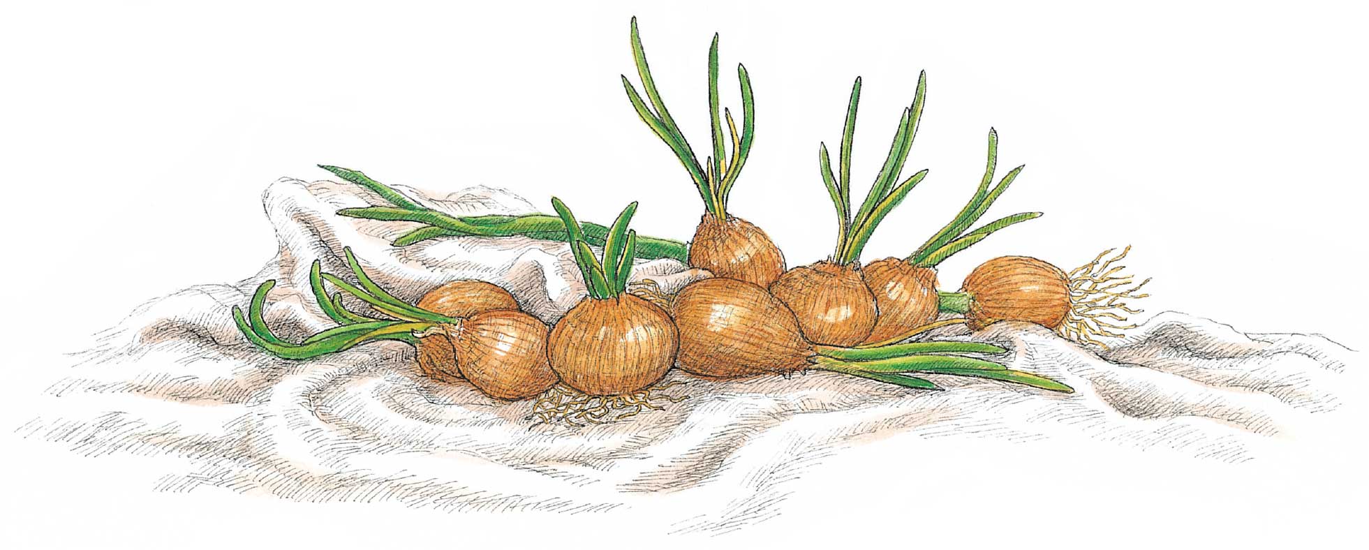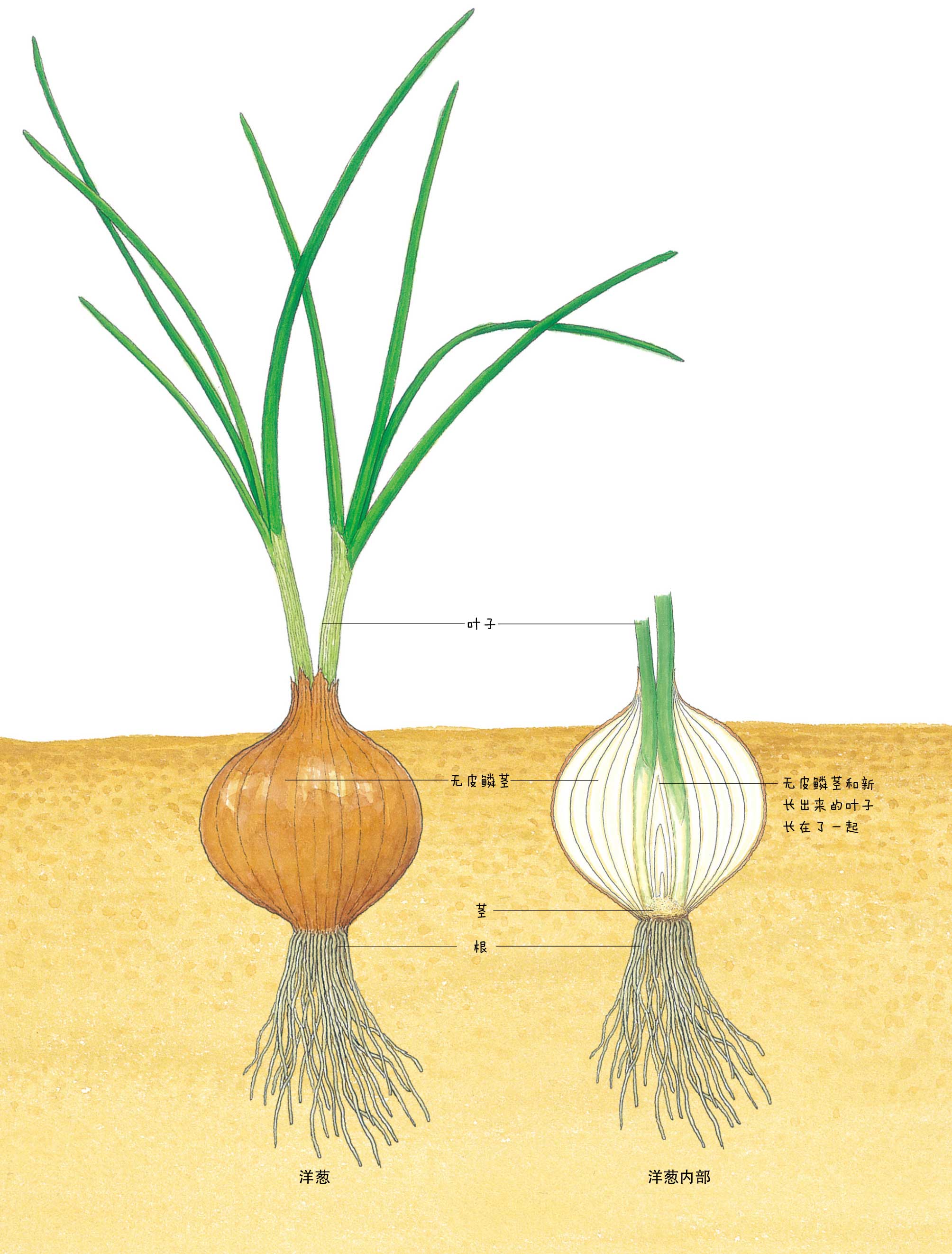 你见过悬挂在农家仓库的洋葱吗?当冬天过去,天气渐渐好转时,洋葱开始迎接春天的到来。被很多层无皮鳞茎包围,处在洋葱最深处的绿芽会往上露出头来。从这时开始,新发出的芽会迅速地吸收掉无皮鳞茎中的养分。曾经厚重多汁的芽鳞皮会变得特别干瘪。这时,如果农民伯伯仍没有把洋葱种到土里,等到养分被吸收完以后,迎接洋葱的就是死亡了。