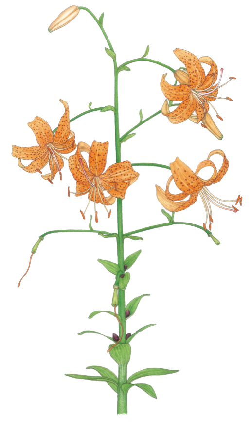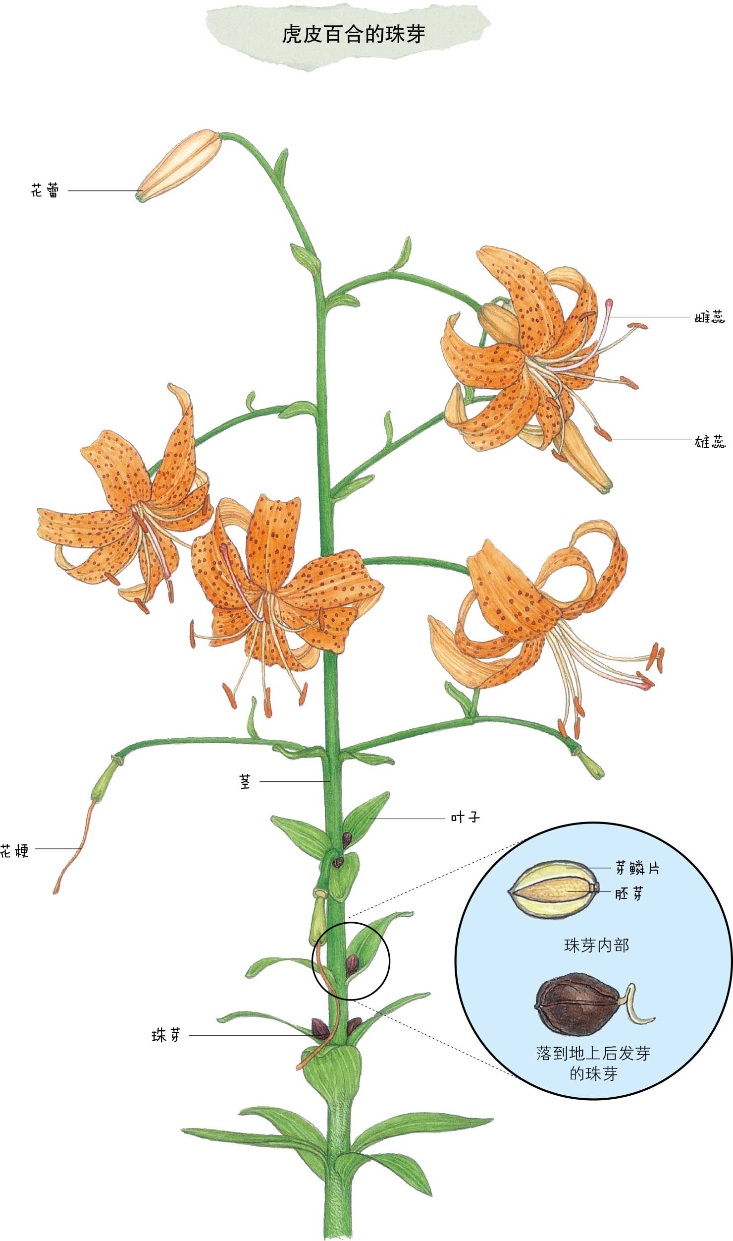 秋雨过后,落叶和土壤将珠芽掩埋了起来。于是珠芽开始生根,并迎接冬天的来临。等到春天到来时,珠芽开始长出蓝色的叶子,一棵虎皮百合就这么长大了。
