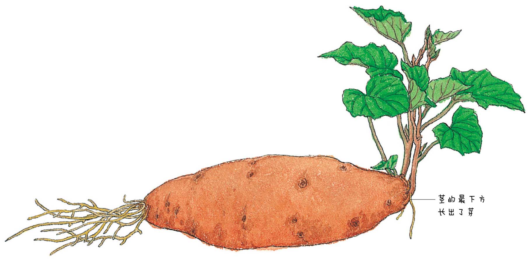 那么接下来,我们更仔细地观察一下红薯吧。红薯的胚芽并不是四散在各处,而是集中在一边。在胚芽聚集的地方,会长出很多绿芽。这些绿芽会在前一年茎断掉的地方冒出头来。在绿芽没有长出的地方会布满白色的须根。这跟土豆有着很大的区别。这也证明了土豆是块茎,红薯是块根。虽然形态相似,但实际上土豆和红薯有着很大的差异。