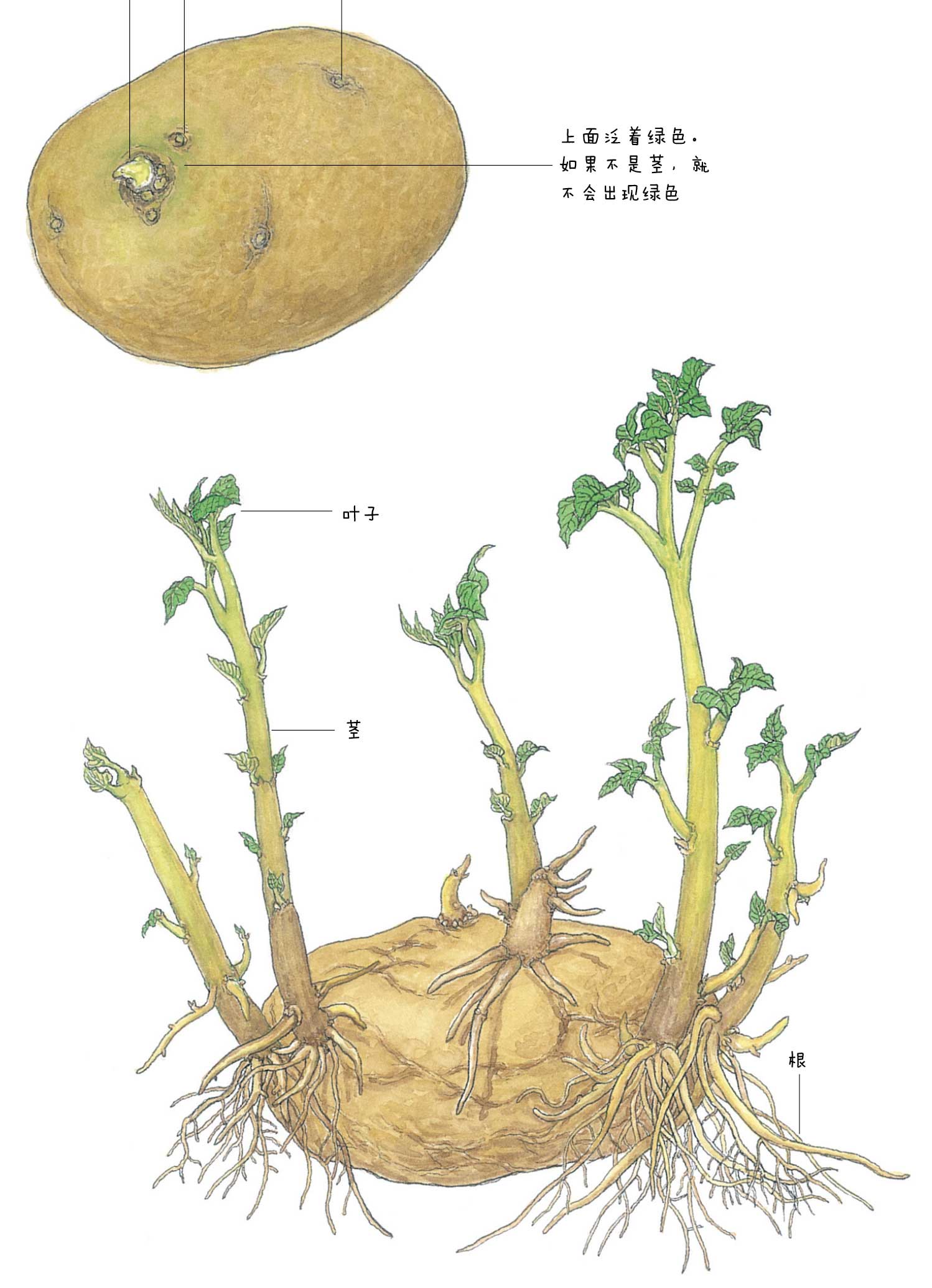 还有一点可以说明土豆是茎。茎的内部存在叶绿素,接受阳光的照射后,它会变成绿色。土豆经过阳光的照射后也会变成绿色,所以土豆是茎。