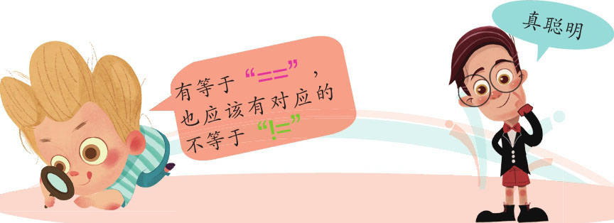 是不是感觉==似曾相识呢?这和我们之前学过的赋值运算符“=”很像,但是它们完全不一样哦。=是给变量赋值的,只有一个等号,而==是对比两边的值是否相等,有两个等号。