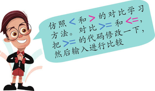 这个比较运算符的作用是比较两边的数字是不是大于等于的关系。我们来写一个程序,在屏幕上显示一个数字,小朋友想出一个比它大的数字,就能得到奖励哦。