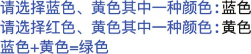 color=input("请选择蓝色、黄色其中一种颜色:") mColor = input("请选择红色、黄色其中一种颜色:") if color == "蓝色" and mColor == "红色": print("蓝色+红色=紫色") elif color == "蓝色" and mColor == "黄色": print("蓝色+黄色=绿色”) elif color == "黄色"” and mColor == "红色": print("黄色+红色=橙色”) elif color == "黄色” and mColor == "黄色": print("哈哈 我还是黄色") else: print("输入错误,请重新输入")