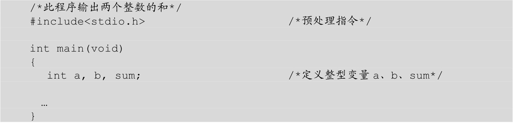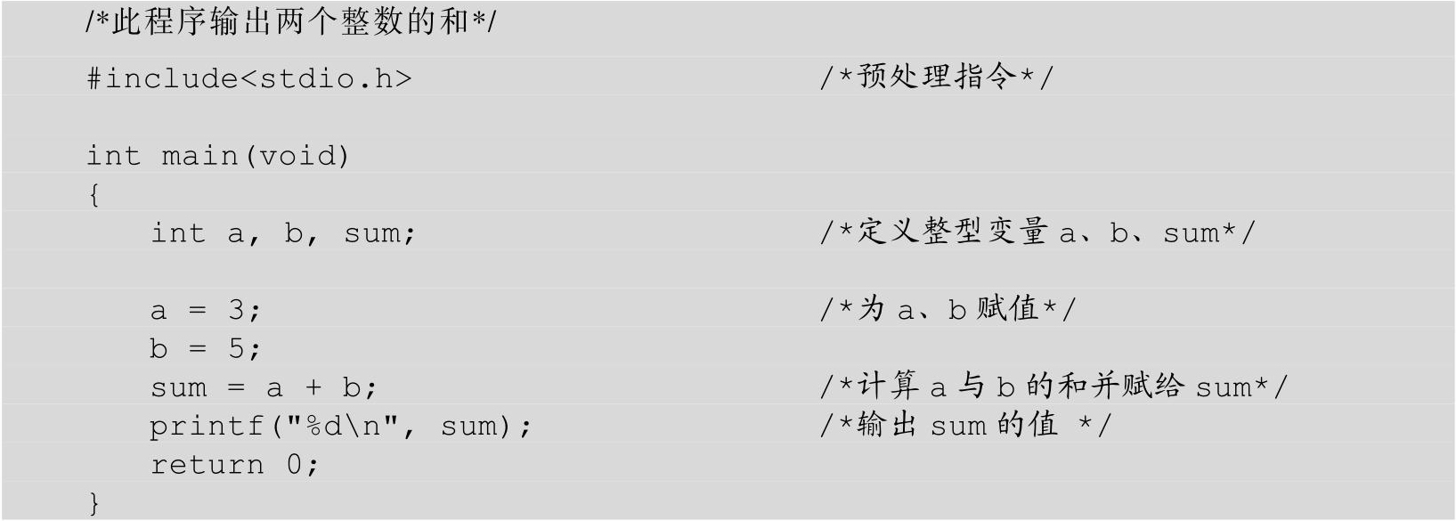 C程序的执行部分是由语句组成的。程序的功能也是由执行语句实现的。程序1-2中用到了三种语句,一种是赋值语句,如“sum=a+b;”;一种是返回语句,如“return 0;”;还有一种是函数调用语句,如printf("%d\n",sum)。要求某个函数执行分派给它的任务称为调用这个函数。