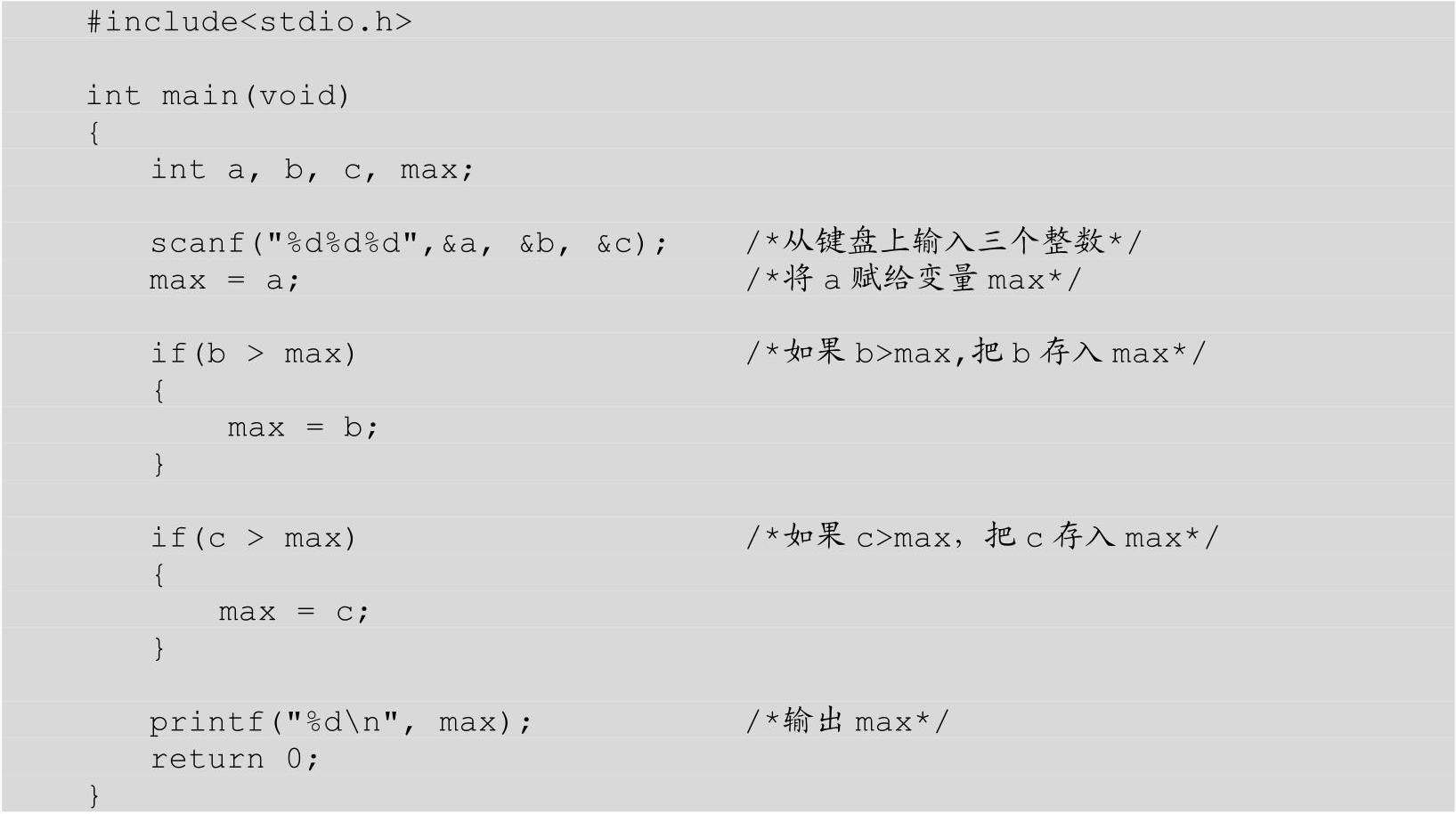 方法2: 如果用程序3-3的方法,则可在程序3-3的基础上进行扩充。在程序3-3中,已将a和b的最大值存入max,在此基础上,让c与max比较:如果c > max,则用c更新max。