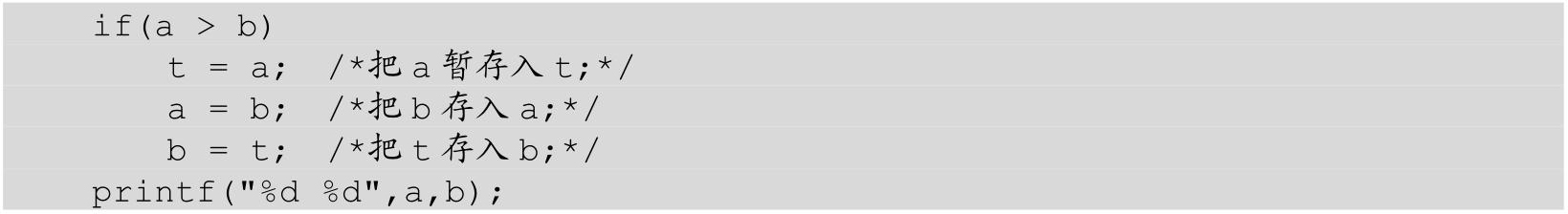 为什么出现这样的结果?通过单步执行会发现,只有“t=a;”这条语句受if的限制,而“a=b;b=t;”这两条语句不再受if的限制,当if后面的条件不成立时也会被执行,因此会把b的值赋给a,把t的值赋给b,而t没有初始化,所以b被赋为一个垃圾值。