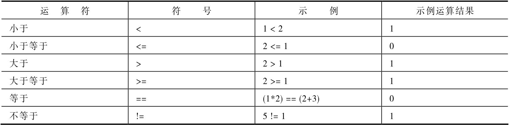关系运算符用于比较整数和浮点数,也允许比较混合类型的操作数。常用的关系运算符如表3-1所示。