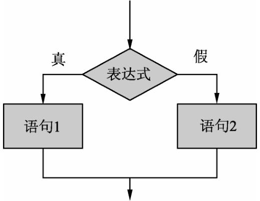 对应的流程图如图3-1所示,如果表达式的值为真,则执行语句1,否则执行语句2。其中,语句1和语句2可以是一条单独的语句,也可以是用花括号括起来的一组语句。