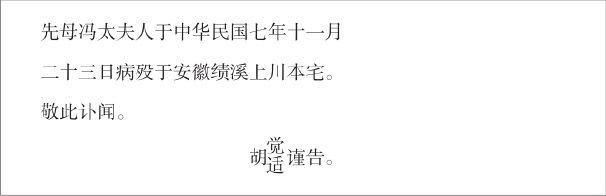 我在京时,家里电报问“应否先殓”,我复电说“先殓”。我们到家时,已殓了七日了,衣衾棺材都已办好,不能有什么更动。我们徽州的风俗,人家有丧事,家族亲眷都要送锡箔,白纸,香烛;讲究的人家还要送“盘缎”,纸衣帽,纸箱担等件。锡箔和白纸是家家送的,太多了,烧也烧不完,往往等丧事完了,由丧家打折扣卖给店家。这种糜费,真是无道理。我到家之后,先发一个通告给各处有往来交谊的人家。通告上说: