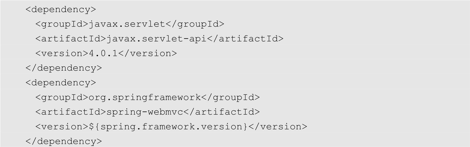 一个最简单的Spring MVC项目只需要javax.servlet-api和spring-webmvc这两个jar包。在maven项目的pom.xml中加入这两个jar包的依赖,具体代码如下: