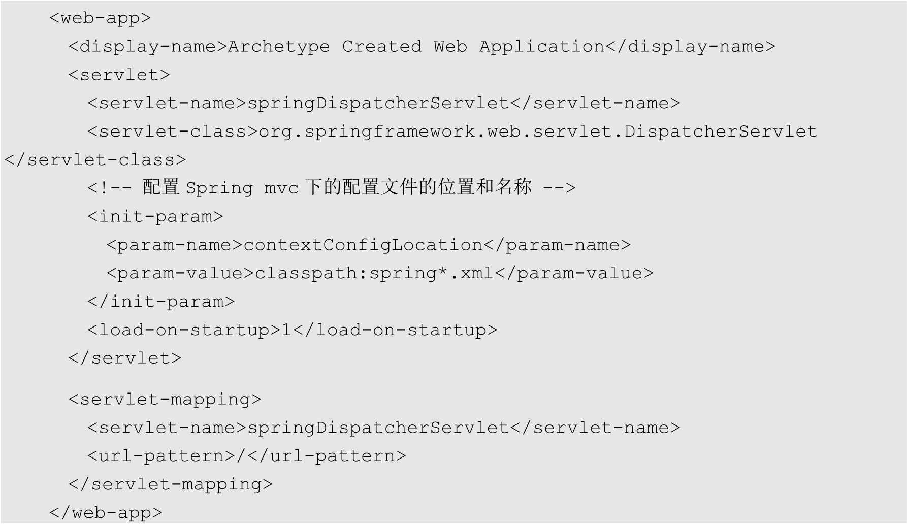 (4)配置web.xml文件。指定Spring MVC核心Servlet和相关的配置文件即可: