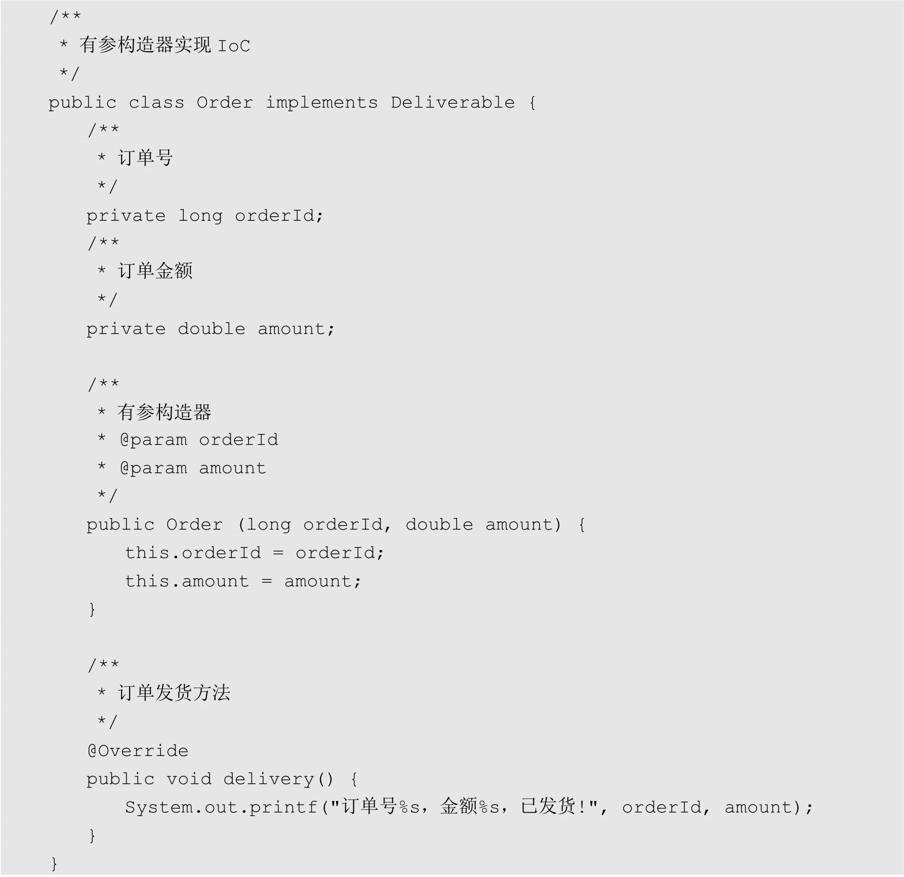 与User类不同的是,Order类是没有无参构造器的,Order类含有一个带有两个参数——订单号和订单金额的有参构造器。Order类的定义如下: