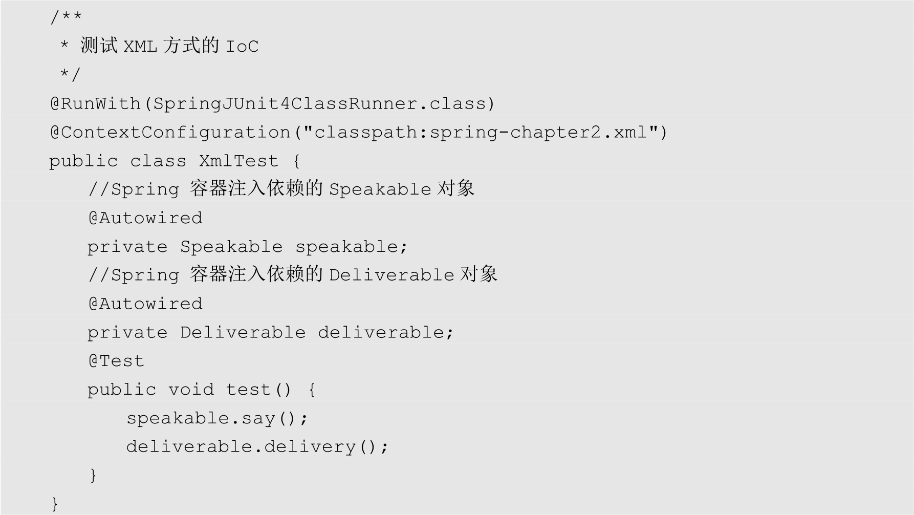 在单元测试类XmlTest中,通过依赖注入得到Speakable的对象User和Deliverable的对象Order,单元测试代码如下: