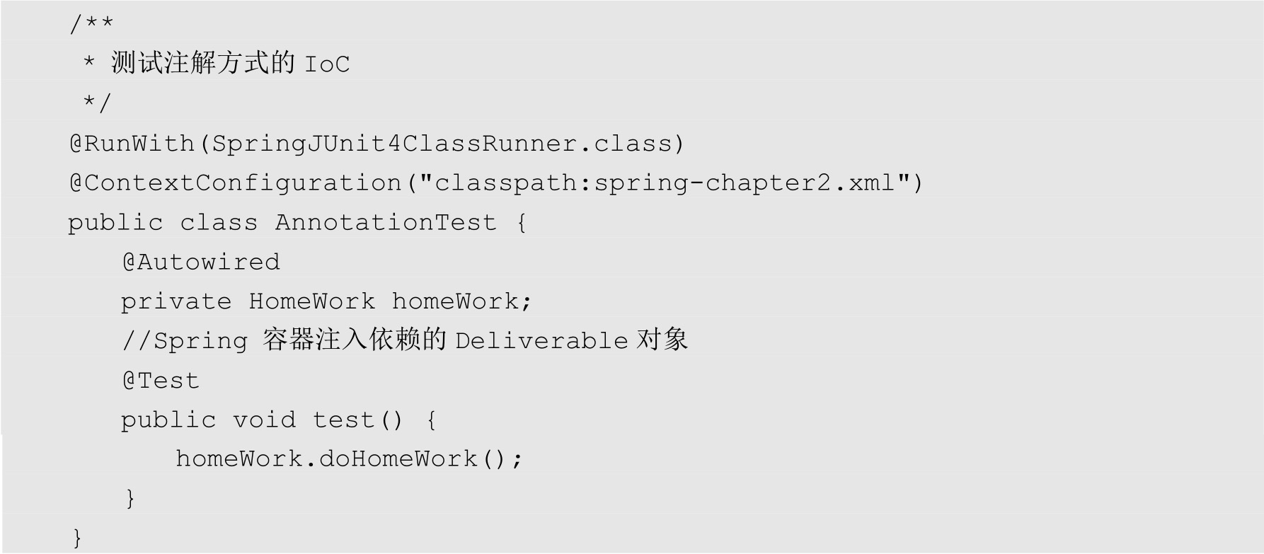 接下来在测试类AnnotationTest中通过依赖注入,将HomeWork对象注入到AnnotationTest测试类中,测试代码如下: