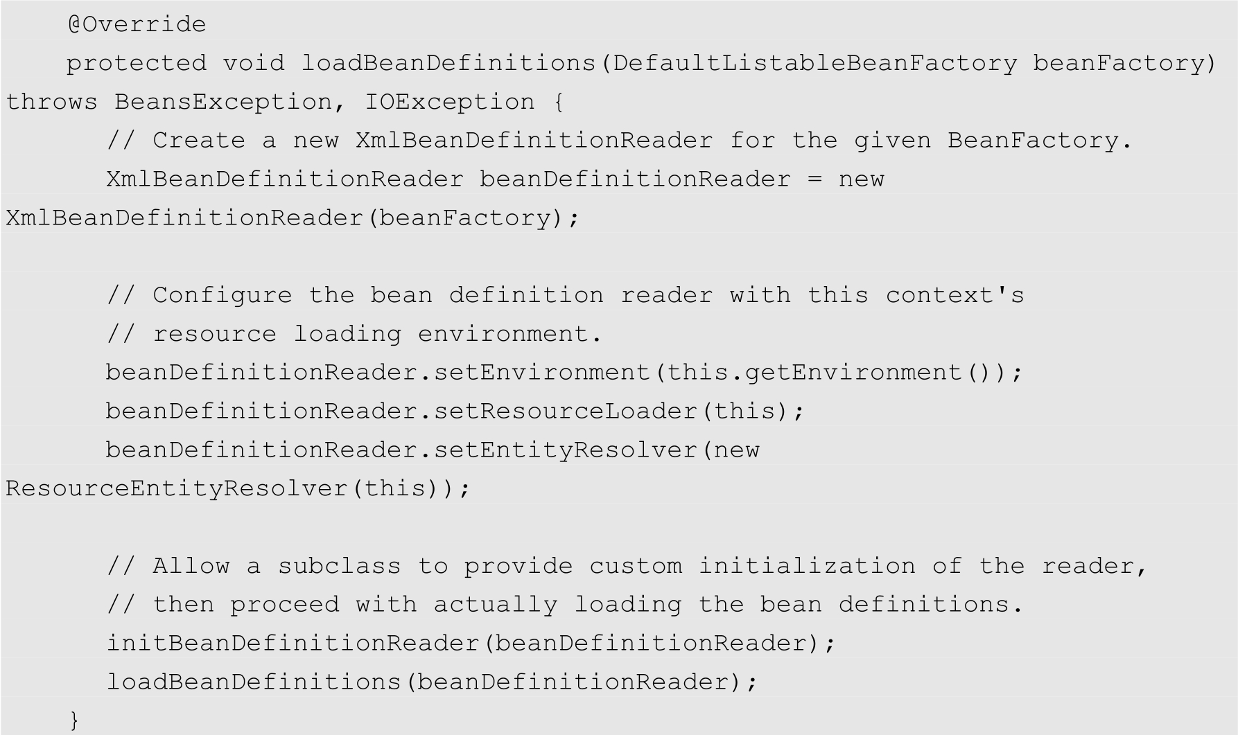 loadBeanDefinitions(DefaultListableBeanFactory beanFactory)方法中,通过上一步创建的空的BeanFactory来创建一个XmlBeanDefinitionReader对象。XmlBeanDefinitionReader是用来解析XML中定义的bean的。下面重点讲解loadBeanDefinitions(beanDefinitionReader)方法,这是一个重载的方法,这个方法的入参是刚刚生成的XmlBeanDefinitionReader对象。下面将进入重载的loadBeanDefinitions方法进行分析,代码如下: