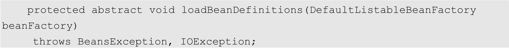 DefaultListableBeanFactory beanFactory = createBeanFactory();这行代码只是创建了一个空的BeanFactory,其中没有任何Bean。因此refreshBeanFactory()方法的核心功能是在loadBeanDefinitions(beanFactory);这行代码中实现的。进入loadBeanDefinitions(beanFactory)方法进行分析。