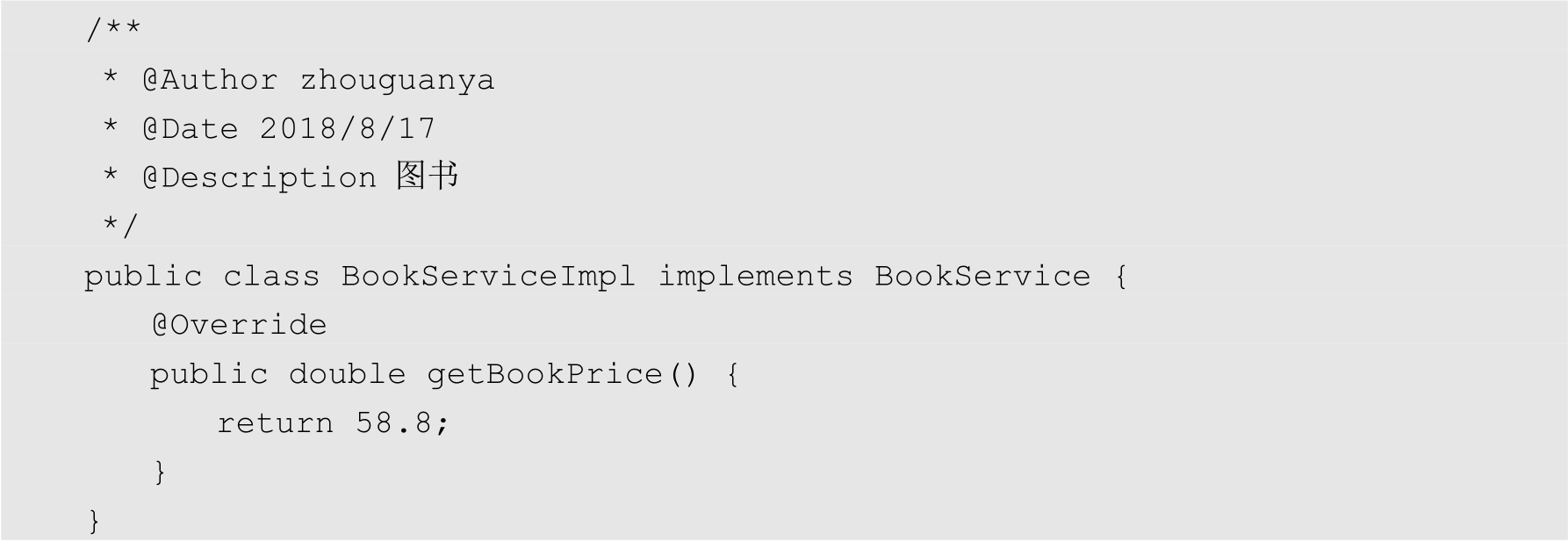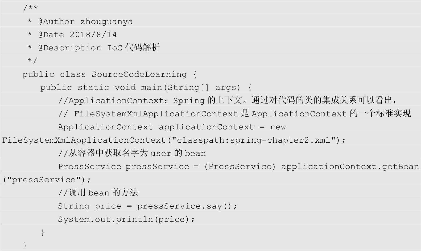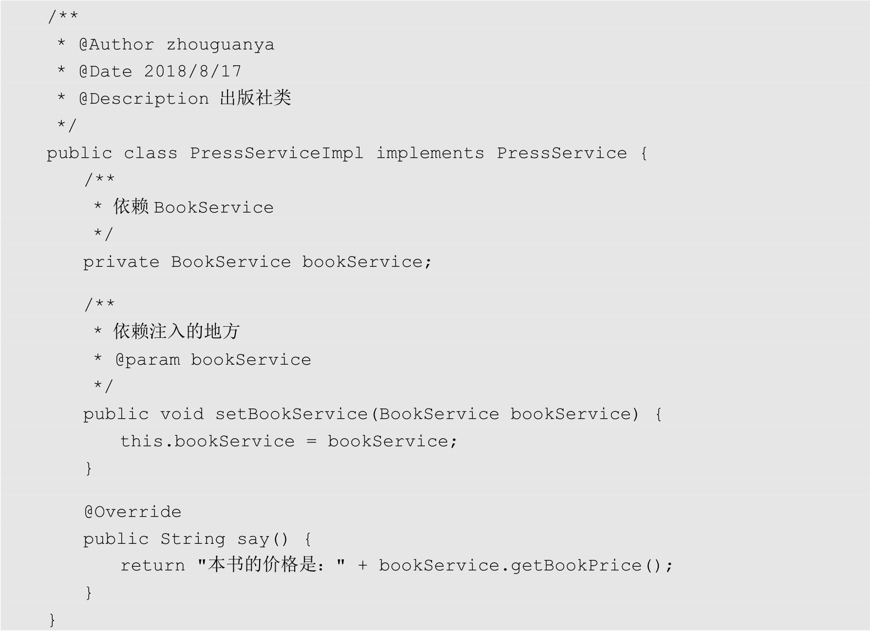 下面将对以上两步做具体的分析。为了能更加直观地查看IoC启动过程,本书通过一个简单的示例代码,一步步走进Spring底层代码。创建一个出版社类PressServiceImpl和图书类BookServiceImpl,PressServiceImpl依赖BookServiceImpl,PressServiceImpl类源代码如下: