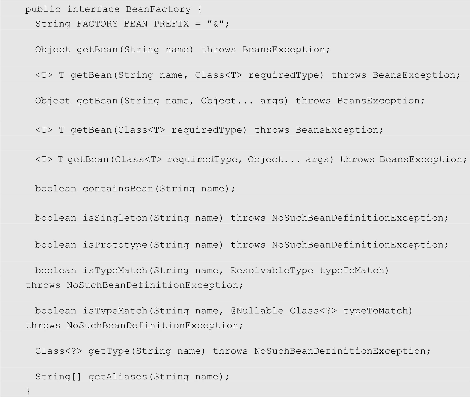 这是整个IoC容器最顶层接口,其定义了一个IoC容器的基本规范,以下是Spring BeanFactory的接口定义。限于篇幅原因,删除了大量的代码注释。BeanFactory是一个低配版的IoC容器,其定义了IoC容器基本的功能。BeanFactory具体代码如下: