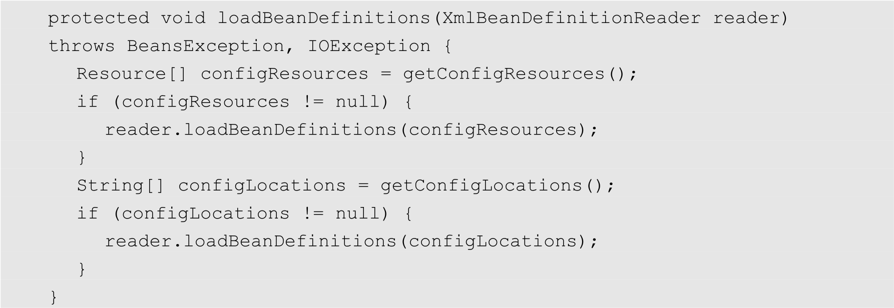 如图2-9所示,loadBeanDefinitions方法的实现是在XmlBeanDefinitionReader中。具体实现如下: